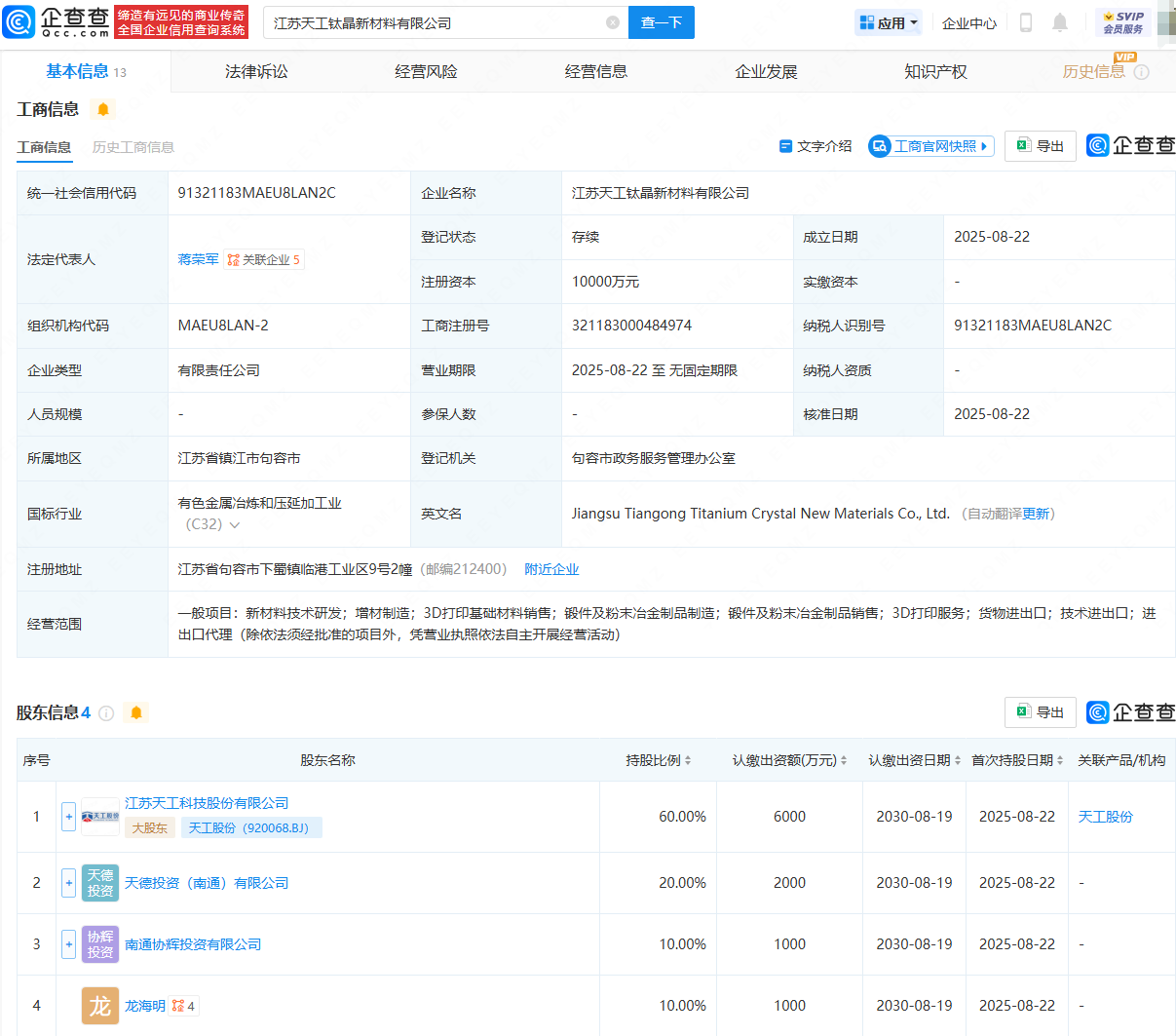江苏天工钛晶新材料有限公司成立,法定代表人为蒋荣军,注册资本为1亿元银铺子配资,经营范围包含:新材料技术研发;增材制造;3D打印基础材料销售;锻件及粉末冶金制品制造;锻件及粉末冶金制品销售;3D打印服务等。企查查股权穿透显示,该公司由天工股份(920068)、天德投资(南通)有限公司等共同持股。